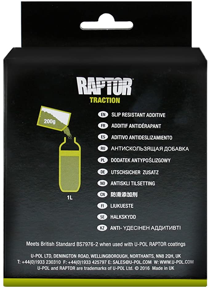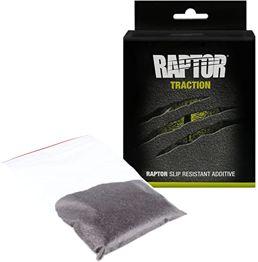 El Aditivo antideslizante. Se puede agregar directamente a las botellas de revestimiento protector RAPTOR Negro y Tintable antes de la pulverización. RAPTOR TRACTION está empaquetado en una conveniente bolsa con cierre hermético de 200 g y llenará una botella de RAPTOR para una aplicación típica antideslizante.